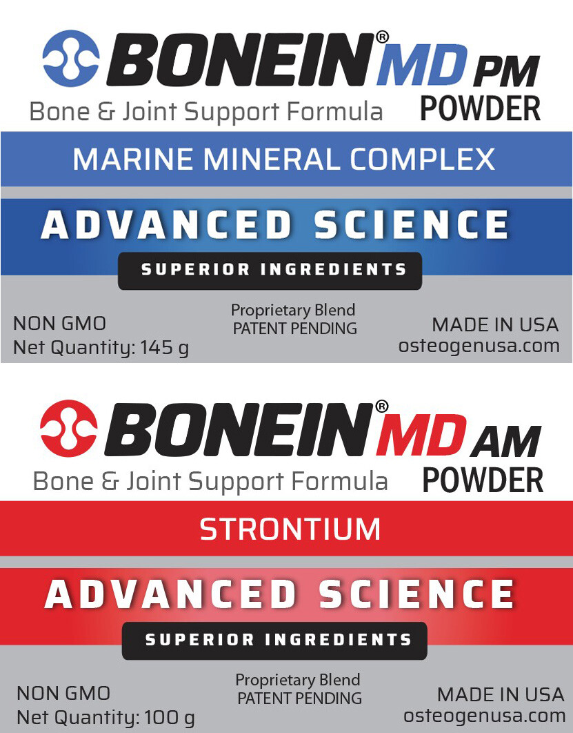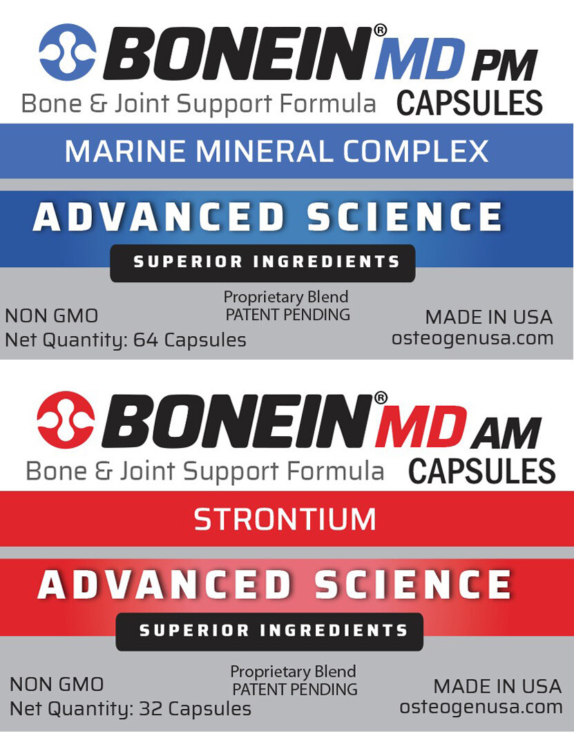BONEIN MD is a 2 part formulation comprised of Strontium Citrate Capsules and the marine multi-mineral complex Red Algae Calcium capsules. They are the same core ingredients found in our innovative equine feed supplement.